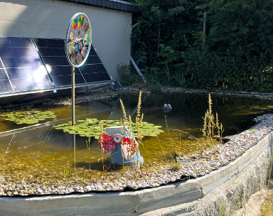 Zudem zeigt ein Wasserrückhaltebecken, welches sich gleichzeitig als Biotop für Amphibienarten ausweist, wie Regenwasser effizient gespeichert werden kann, um es im Garten zu nutzen und somit den Wasserverbrauch zu reduzieren.