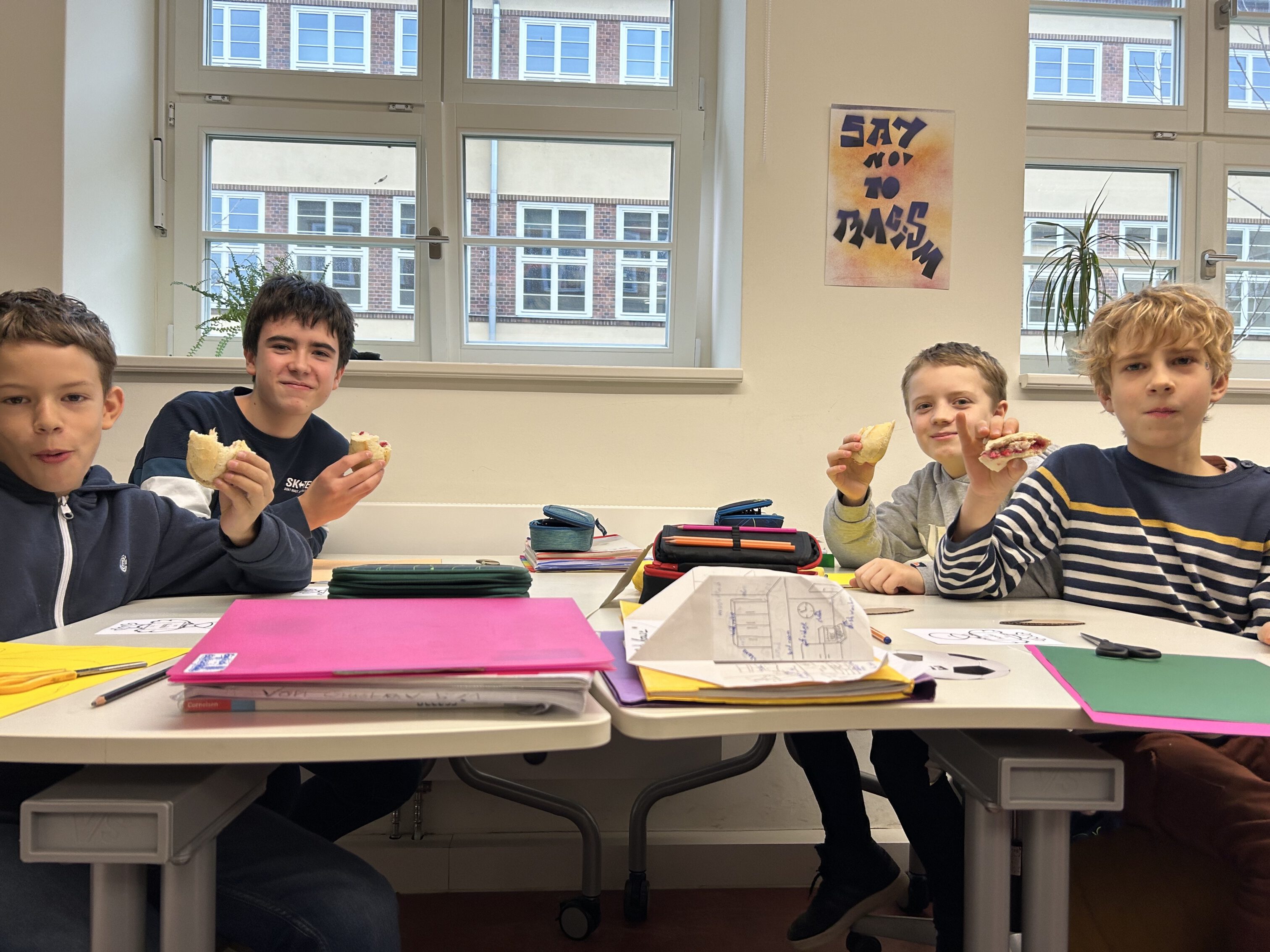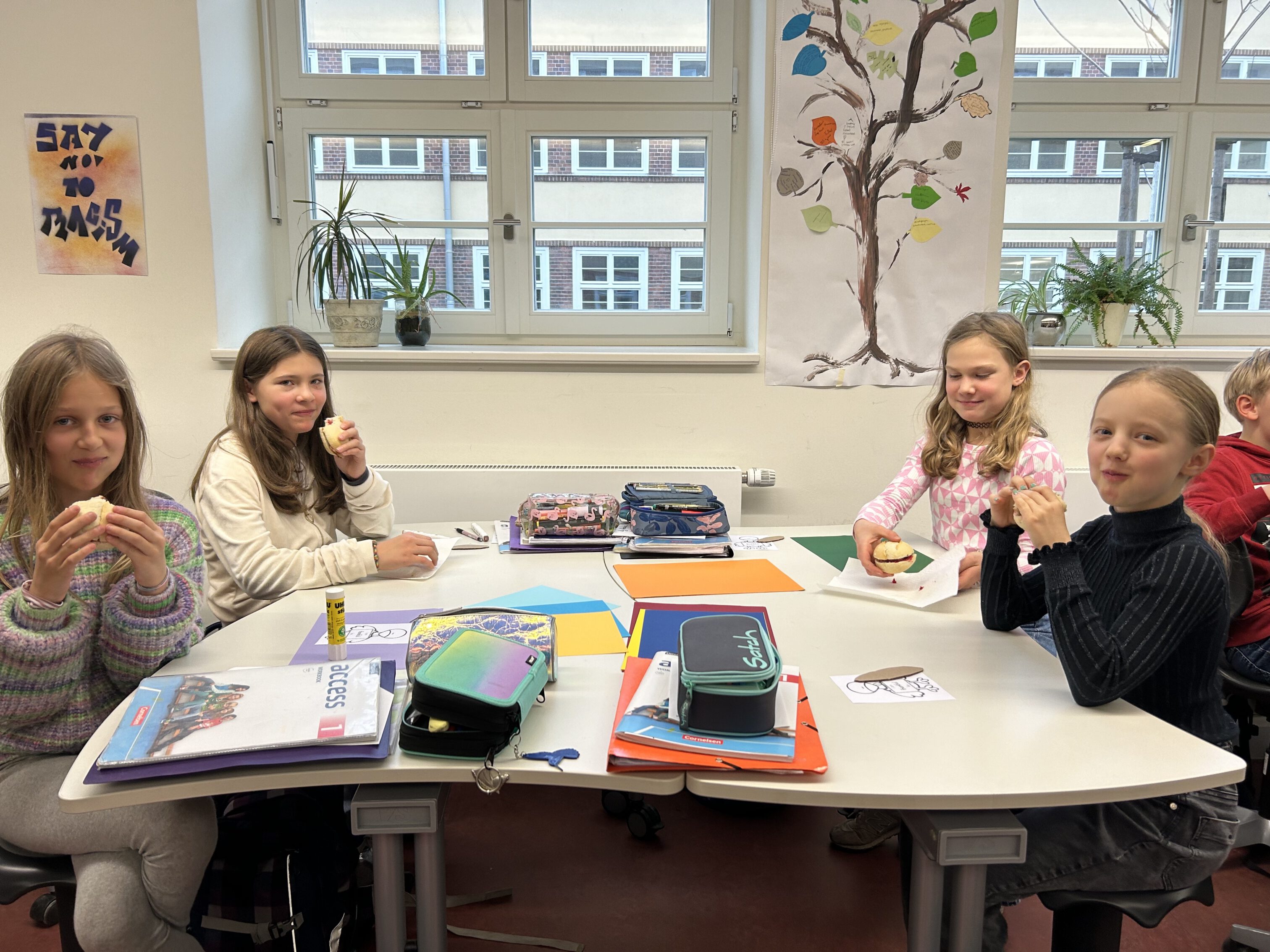Die Stunde mit Herrn Tomer was sehr schön und interessant. Es war eine abwechslungsreiche Erfahrung. Er hat viele unserer Fragen beantwortet und uns sehr gut über Thanksgiving informiert. Die Brötchen, die er für uns mitgebracht hat mit Truthahn, Bacon und Cranberrysauce waren sehr lecker! Wir finden Thanksgiving ist ein tolles Fest und die Idee dahinter ist sehr gut.