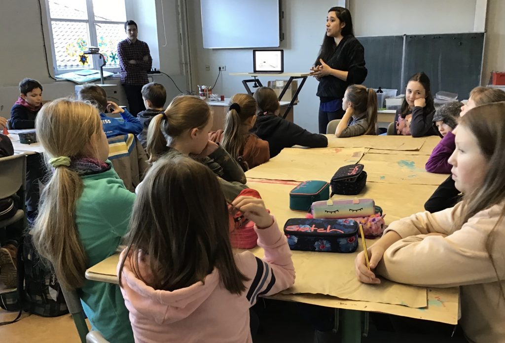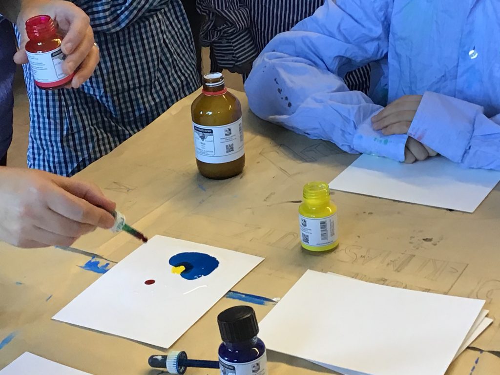 Im Rahmen unserer Reihe Potpourri der Eltern-Berufe – stellten sich uns, der Klasse 5/1, heute das Künstlerpaar Carolina Perez Pallares und Benjamin Appel vor. Nachdem wir einen Einblick in Carolinas farbige Video-Performances und Installationen erhalten haben, durften wir selbst Farbe verlaufen lassen und staunten über die zufällig entstanden Wege und Formen der Farbe. Benjamin Appel sprach mit uns über das Bauen von Häusern und Nestern und ließ uns in Erinnerungen an Räumen schwelgen.
